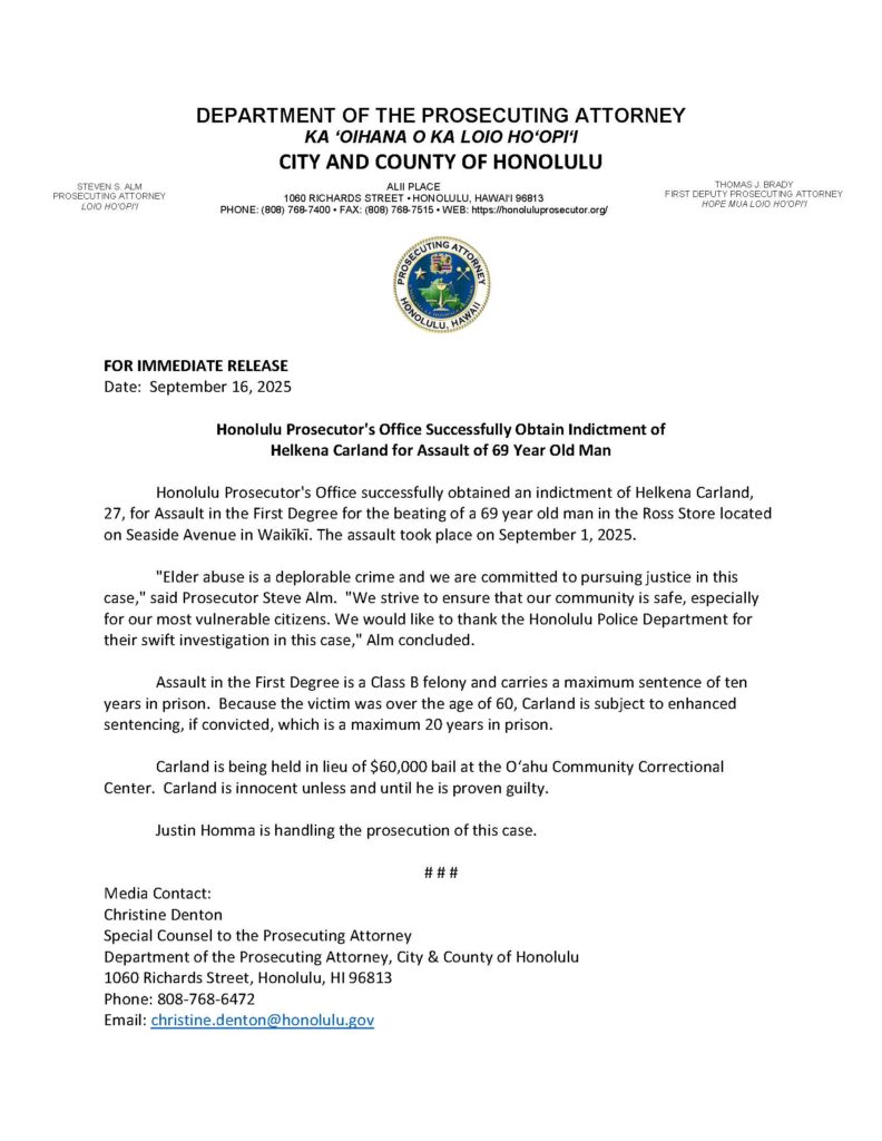 Honolulu Prosecutor’s Office Successfully Obtain Indictment of Helkena Carland for Assault of 69 Year Old Man