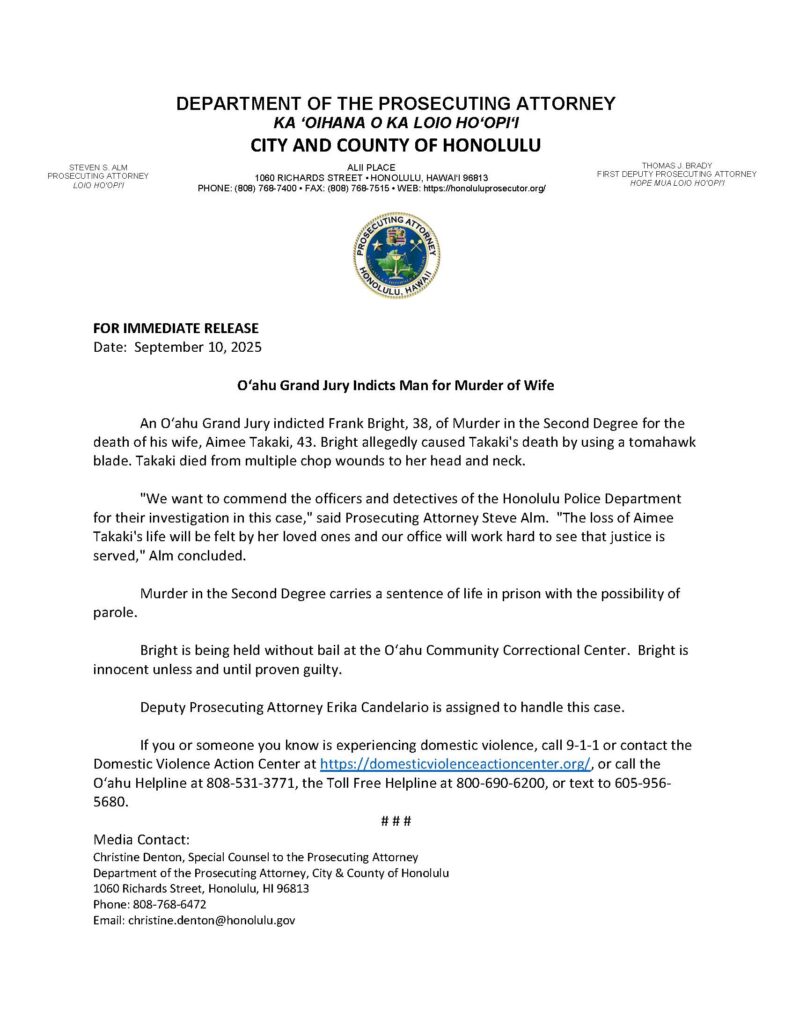 Oʻahu Grand Jury Indicts Man for Murder of Wife