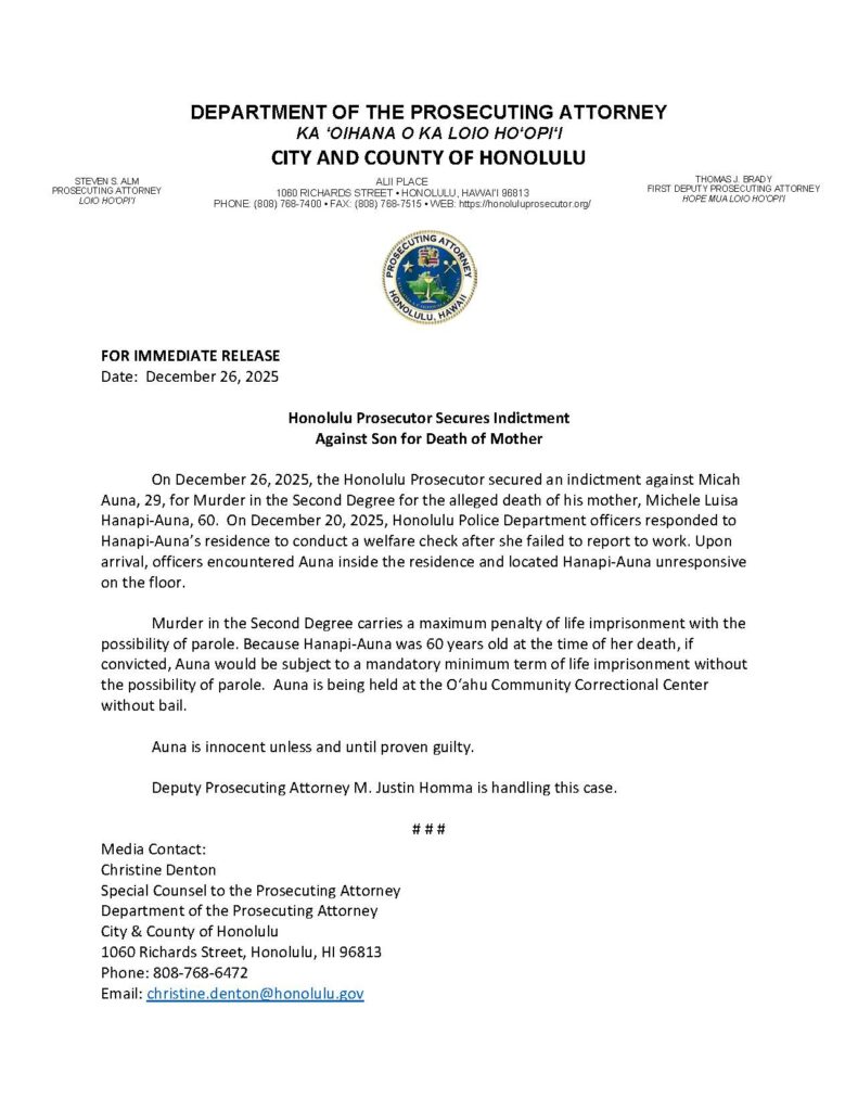 Honolulu Prosecutor Secures Indictment Against Son for Death of Mother