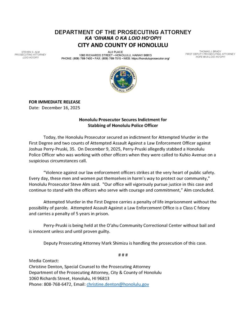 Honolulu Prosecutor Secures Indictment for Stabbing of Honolulu Police Officer